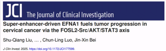中山大学肿瘤防治中心研究员、中山大学香港高等研究院院长助理贝锦新团队在Journal of Clinical Investigation发表题为Super-Enhancer-Driven EFNA1 Fuels Tumor Progression in Cervical Cancer via the FOSL2-Src/AKT/STAT3 Axis的研究论文。该研究通过整合染色质免疫沉淀测序(ChIP-Seq)和转录组测序(RNA-Seq)数据,描绘了宫颈癌特异的SE图谱,进一步结合体内、体外模型和分子机制研究,揭示了肿瘤特异的EFNA1-SE通过驱动EFNA1表达促进宫颈癌恶性进展的机制,并探讨了靶向EFNA1下游信号通路治疗宫颈癌的临床应用前景。