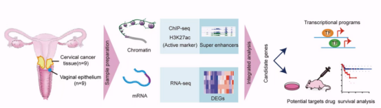 超级增强子(Super-enhancer, SE)作为高阶染色质调控元件,通过协同多个增强子区域聚集而成,能够驱动肿瘤关键基因的异常表达。既往研究虽提示SE在宫颈癌等多种癌症发生中的作用,但受限于技术手段和临床样本来源,目前大多数筛选SE的研究多依赖于体外传代细胞系,难以真实反映肿瘤组织内SE的生物学特性。因此,解析宫颈癌肿瘤组织特异SE图谱及其调控网络,对揭示肿瘤表观遗传驱动机制具有重要科学价值,有助于了解宫颈癌的致病机制,发现表观遗传治疗靶点和策略,最终提高患者预后。