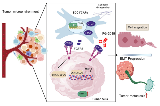 综上所述,该研究通过泛癌单细胞转录组整合分析,首次鉴定并系统验证了 SDC1⁺ CAFs 作为一种跨癌种保守存在的促转移CAF亚型,并全面阐明了其通过 KLF6–CTGF–FGFR3 信号轴驱动肿瘤细胞上皮–间质转化及转移的分子机制。该研究从泛癌层面揭示了CAF亚群在功能上的保守性及其在肿瘤转移过程中的关键调控作用,为深化对肿瘤微环境中基质细胞功能分化与生物学意义的理解提供了重要科学依据,并为实体瘤抗转移治疗策略的开发提出了兼具普适性与特异性的潜在基质靶点组合。