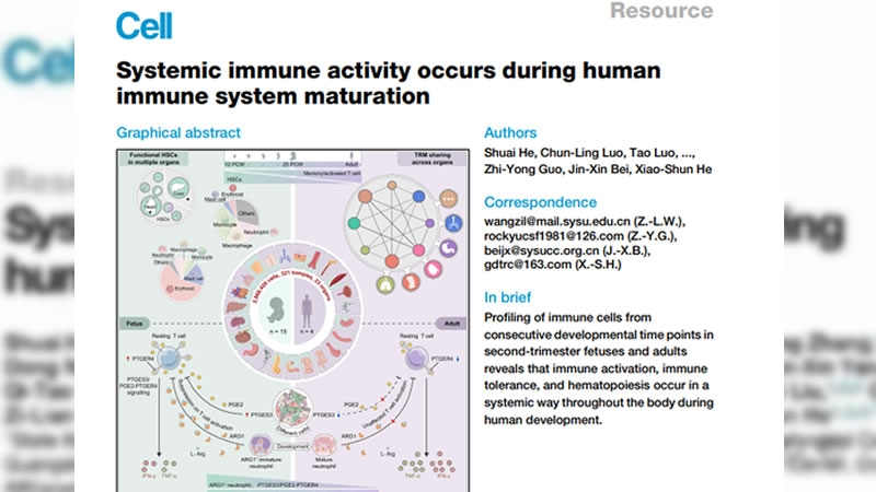 2025年10月28日,中山大学何晓顺、贝锦新、郭志勇、王子莲教授联合团队在Cell 杂志发表题为Systemic immune activity occurs during human immune system maturation的研究论文。该项研究基于胚胎及成人23种组织的321份样本,通过单细胞转录组及TCR测序技术,分析了超过280万个免疫细胞,首次系统性描绘了人类第二孕期免疫系统的动态发育图谱。