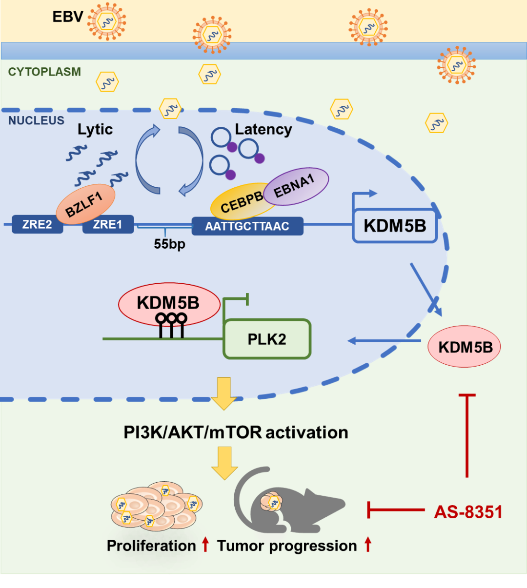 綜上,該研究發現EBV編碼的潛伏基因EBNA1與轉錄因數CEBPB結合促進KDM5B轉錄,而裂解基因BZLF1直接與KDM5B啟動子上的ZRE結合促進KDM5B轉錄;EBV介導的KDM5B上調進一步通過H3K4me3去甲基化途徑抑制PLK2的表達,從而啟動下游PI3K/AKT/mTOR信號通路,促進EBV相關上皮腫瘤的惡性進展;靶向KDM5B的抑制劑AS-8351可顯著抑制EBV相關上皮腫瘤的惡性進展(圖4)。該研究揭示了 EBV通過調用宿主基因組蛋白修飾途徑促進上皮腫瘤惡性進展的機制,並提出了靶向EBV、KDM5B及其下游調控網路來治療EBV相關上皮腫瘤的潛在策略。