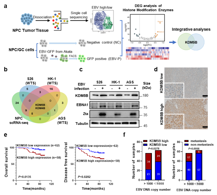 該研究採用多組學整合分析和體外EBV感染模型,聯合鼻咽癌組織單細胞測序數據、EBV陽性的鼻咽癌和胃癌細胞全轉錄組測序數據以及組蛋白修飾因數資料庫,鑒定KDM5B為EBV感染促進上皮腫瘤惡性進展過程中的關鍵組蛋白修飾因數(圖1a-c)。進一步臨床分析顯示,KDM5B高表達與鼻咽癌患者不良預後顯著相關,且其高表達與患者體內高EBV DNA水準密切相關(圖1d-f),提示了 KDM5B在 EBV 相關上皮腫瘤惡性進展中的重要作用。
