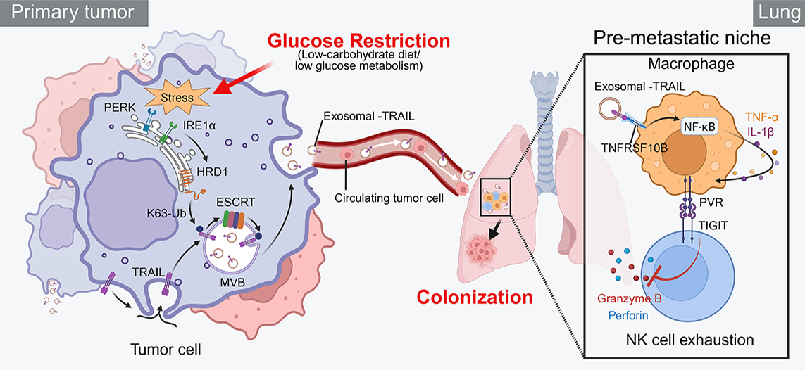 Starting from clinical observations and integrating multi-omics analyses with in vivo experimental evidence, this study systematically elucidates a mechanism by which glucose restriction promotes metastasis through an exosome–immune axis, and identifies the TIGIT pathway as a potential combinatorial therapeutic target. These findings have important implications for both basic research and clinical translation.